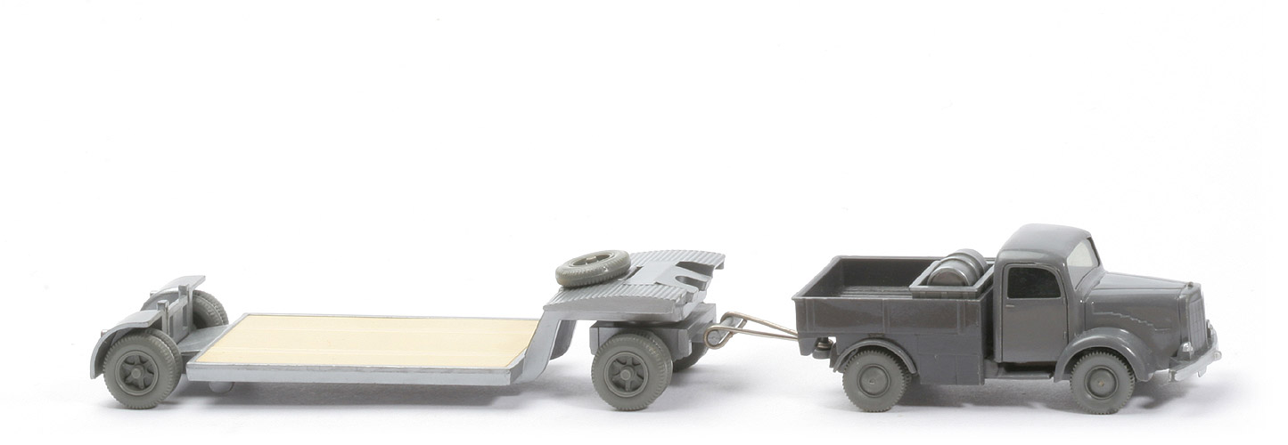 | Zugmaschine | Farbe Kabine | basaltgrau | Version Kabine | ohne Schlitz hinter Nrn-Schild | Blinker | ohne | Verglasung | getönt | Dach | glatt | Bemalung | Scheinwerfer, Nummernschild | Bemalung Stoßstange | mit | Achshalterungen | geschlossen | Chassis Farbe | basaltgrau | Bodenprägung | WM ohne Kreis | Pritsche | anthrazit | Ladung | Kiste mit Öltonne | Farbe Tonne | silber | Räder | 10mm, neuere Ausführung | | Anhänger | Grundfarbe | silber | Hängertyp | Typ 1: Flachzapfenhalterungen | Pritscheneinlage | hellbeige | Deichsel | Metall | Bemalung Rückleuchten | rot | Bemalung Rückstrahler | rot | Räder | 12mm Trilex, einteilig | Farbe Räder | hellgrau |
