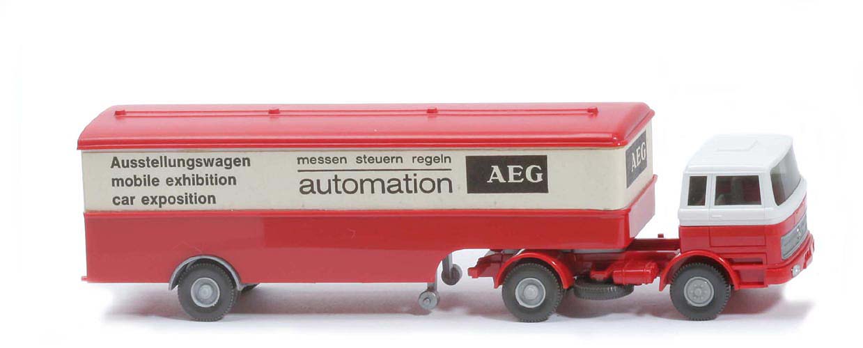 | | Zugmaschine | | Kabine oben | weiß | | Kabine unten | rot | | Streifen | ohne | | Verglasung | getönt | | Inneneinrichtung | ca. lichtgrau | | Lenkrad | ohne | | Grill | silbern | | Stoßstange, Radlauf vorn | rot | | Chassistyp | alt | | Chassisfarbe | rot | | Radlauf hinten | rot | | Reserverad | unter Chassis geklebt | | Sattelpfanne | neu, für dünnen Bolzen | | Räder | 12mm, Profil fein | | Felgen | silbergrau | | | Auflieger | | Kofferdach | rot | | Koffer oben | weiß | | Koffer unten | rot | | Türen | rot, neu mit Versteifung | | Rückleuchten | lang | | Achseinheit, Stützrollen | silbern | | Königsbolzen | integriert | | Halterung Stützrollen | hoch | | Beschriftung | AEG (s. Foto) | | Räder | 12mm, Profil fein | | Felgen | silbergrau | | Art der Beschriftung | Papier-Aufkleber, umlaufend |