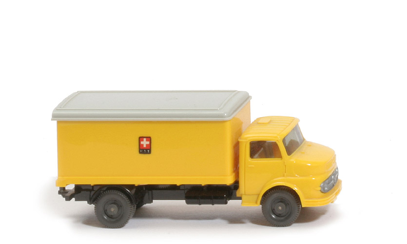 Farbe Kabine | gelb | Typ Kabine | Typ 4a | Dach | mit Lüfter | Eckfenster | ohne | Kotflügel | Teil der Kabine | Blinker | neben dem Grill | Grill | silbern eingesetzt | Inneneinrichtung | mit | Verglasung | getönt | Chassis Art | Typ 2 (wie folgt) | Kotflügel hinten | stark | Kofferabstützung | stegartig | Reserverad | mittig auf Chassis | Bodenprägungen | Wiking, Germany | Chassisfarbe | schwarz | Koffer Farbe | gelb | Koffer | Typ 3 | Rückleuchten | am Chassis | Positionslichter vorn | ohne | Türaufnahmen | unten offen | Türen Farbe | gelb | Türen Typ | Griff als Lasche, waagerechte Streben | Dach | mit stark erhabener Kante | Dach Farbe | lichtgrau | Nummerschild hinten | an Chassis | Beschriftung | PTT | Beschriftung Art | Abziehbild | Räder | 11mm, 6 Loch, Profil fein |