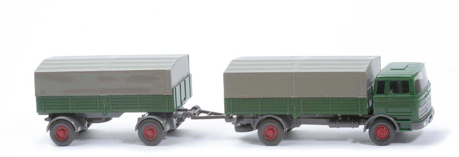 | Zugwagen | Kabine oben | laubgrün | Kabine unten | laubgrün | Streifen | ohne | Verglasung | klar | Inneneinrichtung | ca. hellgelbgrau | Lenkrad | ohne | Stoßstange, Radlauf vorn | staubgrau | hier Aussparung | mit | Chassistyp | Zughaken verstärkt | Chassisfarbe | staubgrau | Radlauf hinten | staubgrau | Reserverad | gesteckt | Pritsche | laubgrün | Pritschengestell | staubgrau | Pritscheneinlage | silber | Plane | betongrau | Räder | 12mm, Profil grob | Felgen | hellbraunrot | | Anhänger | Pritsche | laubgrün | Chassis | staubgrau | Deichsel | Kunststoff | Reserverad | mittig unter Chassis | Pritscheneinlage | silber | Plane | betongrau | Räder | 12mm, Profil grob | Felgen | hellbraunrot |