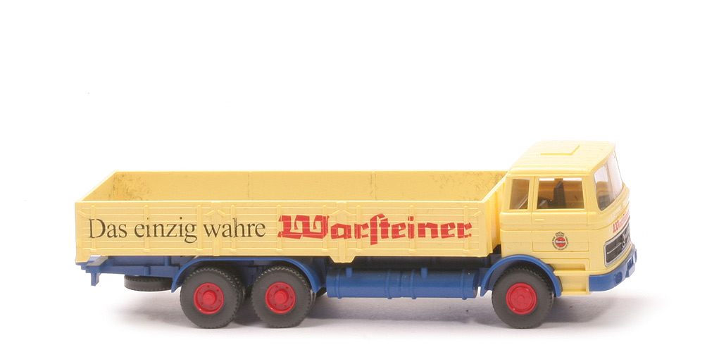 | | Fahrzeug | | Kabine oben | schwefelgelb | | Kabine unten | schwefelgelb | | Streifen | ohne | | Verglasung | klar | | Inneneinrichtung | schwarz | | Lenkrad | integriert | | Druck Front | "Warsteiner" | | Grill | schwarz, Stern, Zierlinien silbern | | Stoßstange, Radlauf vorn | maritimblau | | Chassisfarbe | maritimblau | | Radlauf hinten | 2-teilig, maritimblau | | Reserverad | unter Chassis gesteckt | | Pritsche | schwefelgelb | | Pritscheneinlage | ca. lichtgrau | | Pritsche Druck seitlich | "Das einzig wahre - Warsteiner" | | Pritsche Druck hinten | "Warsteiner" | | Räder | 12mm, Profil grob | | Felgen | 6-Loch, rot |