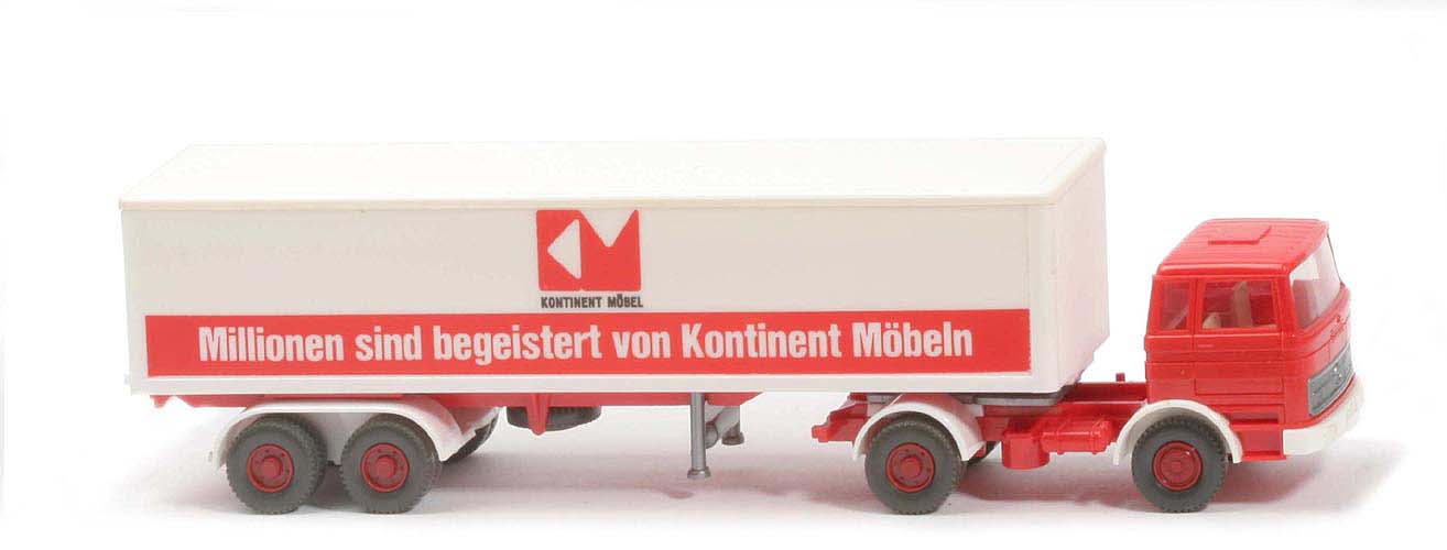 | Zugmaschine | Kabine oben | orangerot | Kabine unten | orangerot | Streifen | ohne | Verglasung | klar | Inneneinrichtung | ca. hellelfenbein | Lenkrad | ohne | Grill | silbern | Stoßstange, Radlauf vorn | weiß | Chassistyp | neu | Chassisfarbe | orangerot | Radlauf hinten | weiß | Reserverad | ohne | Sattelpfanne | für großen Königsbolzen | Räder | 12mm, Profil grob | Felgen | hellbraunrot | | Auflieger | Kofferdach | weiß | Koffer Korpus | weiß | Türen | weiß | Chassis | orangerot | Achseinheit | weiß | Beschriftung Seite | KONTINENT 100mm | Räder | 12mm, Profil grob | Felgen | hellbraunrot | Art der Beschriftung | Druck | Druckbild | matt |