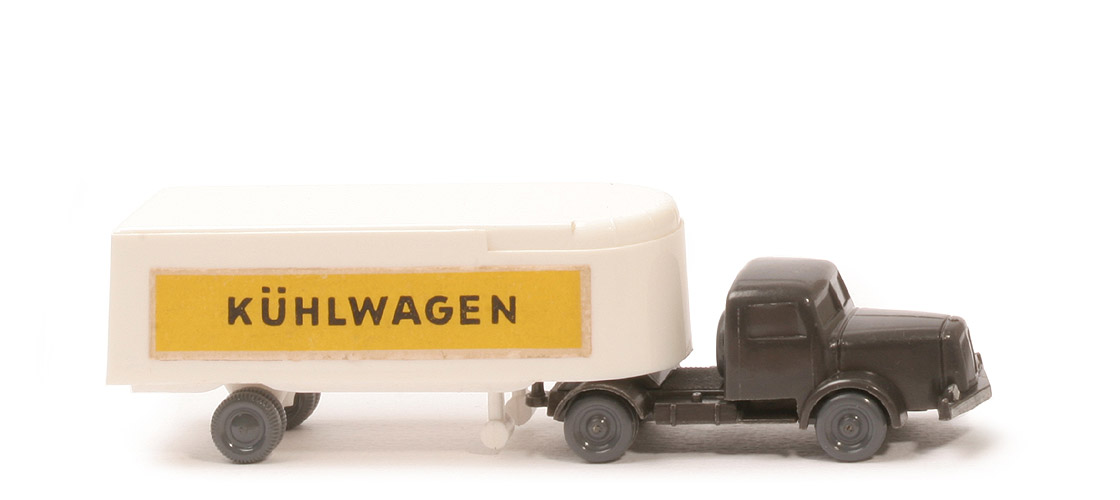 Achsen | Rollachser | | Zugmaschine | Farbe Kabine | anthrazit | Farbe Chassis | anthrazit | Bemalung | Scheinwerfer und Stoßstange silbern | Sattelpfanne | eingesetzt, in Chassisfarbe | Chassis | Version 1a | Achshalterungen | geschlossen | Bodenprägung | WM im Kreis | Reserverad | hinter Kabine | Räder | ohne Profil, dunkelbasaltgrau | | Auflieger | Farbe Oberteil | weiß | Farbe Unterteil | weiß | Radlauf | ohne Kotflügel | Bodenprägung | WM im Kreis | Rückleuchten | ohne | Dach | glänzend | Aufkleberart | Papier, matt | Beschriftung | Kühlwagen (s. Foto) | Beschriftung Farbe | gelb mit schwarzer Schrift | Räder | mit Profil, dunkelbasaltgrau |