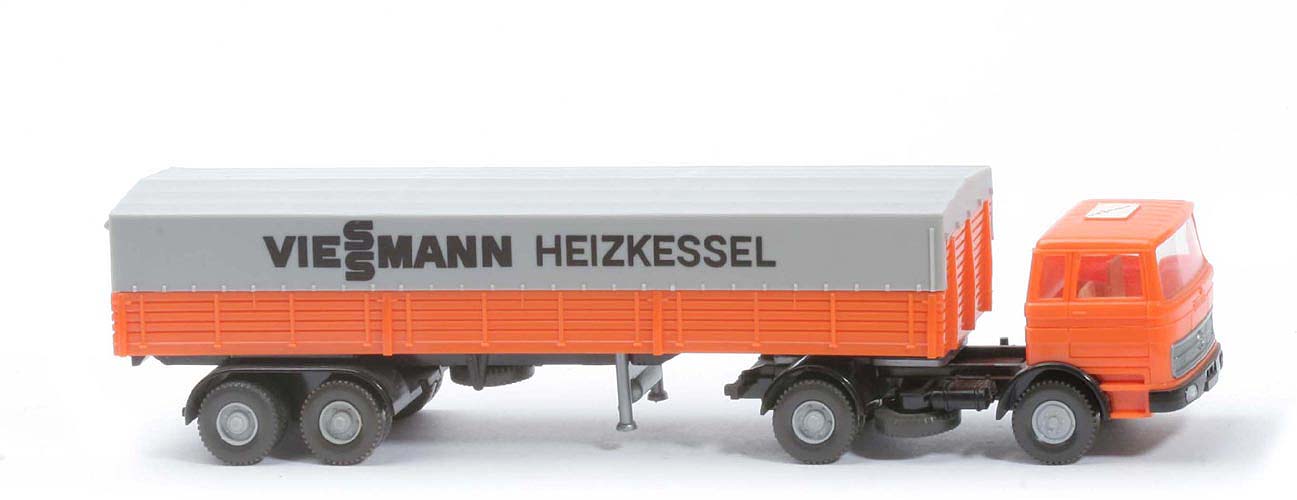 | Zugmaschine | Kabine oben | orange | Kabine unten | orange | Streifen | ohne | Verglasung | klar | Inneneinrichtung | ca. hellelfenbein | Lenkrad | ohne | Grill | silber | Stoßstange, Radlauf vorn | schwarz | Chassistyp | neu | Chassisfarbe | schwarz | Radlauf hinten | schwarz | Reserverad | unter Chassis | Sattelpfanne | für großen Königsbolzen | Räder | 12mm, Profil grob | Felgen | silbergrau | Beschriftung Kabine | Dachaufkleber | | Auflieger | Farbe Pritsche | orange | Pritschentyp | mit Lasche | Chassis | schwarz | Pritscheneinlage | ca. kieselgrau | Achseinheit | schwarz | Bodenprägung Achseinheit | Germany/Wiking | Königsbolzen | stark | Plane | Seite glatt, vorne Aussp | Plane Farbe | silbergrau | Räder | 12mm, Profil grob | Felgen | silbergrau | Beschriftung | VIESSMANN in schwarz | Art der Beschriftung | Druck |