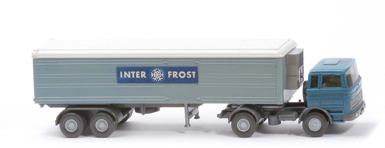 | Zugmaschine | Kabine oben | azurblau | Kabine unten | azurblau | Streifen | ohne | Verglasung | klar | Inneneinrichtung | ca. lichtgrau | Lenkrad | ohne | Grill | silbern | Stoßstange, Radlauf vorn | basaltgrau | Chassistyp | neu | Chassisfarbe | basaltgrau | Radlauf hinten | basaltgrau | Reserverad | hinter Kabine | Sattelpfanne | für großen Königsbolzen | Räder | 12mm, Profil grob | Felgen | silbergrau | Beschriftung Kabine | ohne | | Auflieger | Kofferdach | altweiß | Koffer Korpus | hellblaugrau | Türen | altweiß | Kühlaggregat | mit | Chassis | basaltgrau | Achseinheit | anthrazit | Beschriftung Seite | INTER * FROST | Räder | 12mm, Profil grob | Felgen | silbergrau | Art der Beschriftung | Papier-Aufkleber |