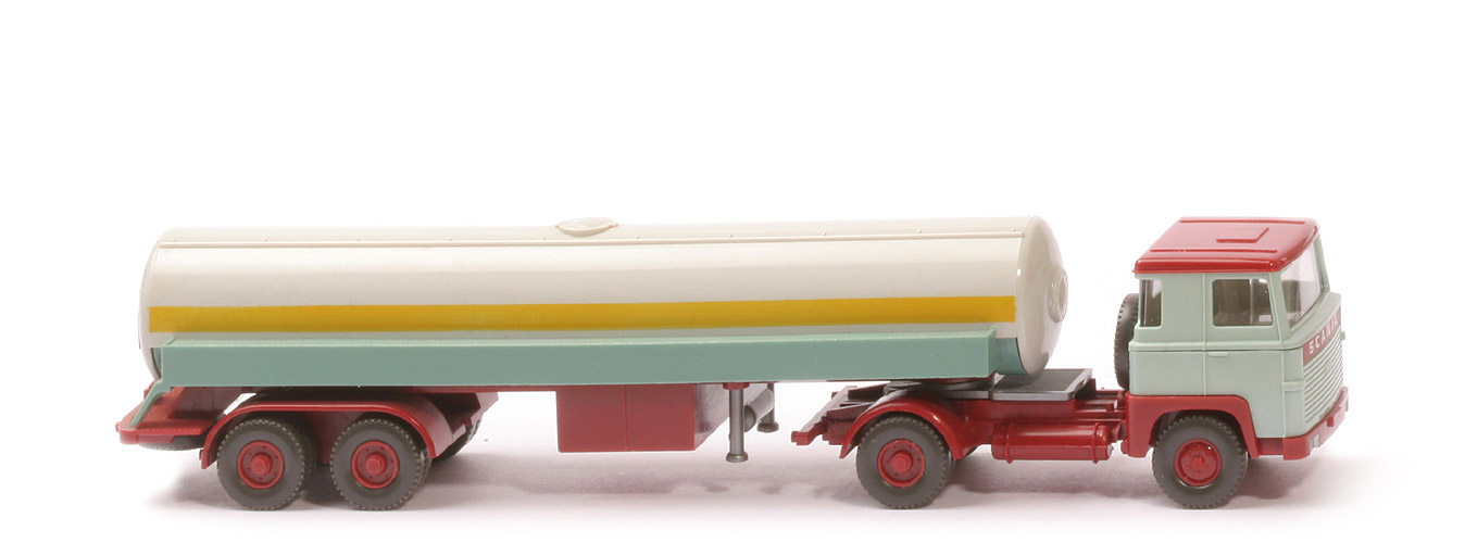 | Zugmaschine | Dach | hellbraunrot | Kabine oben | lichtgrün | Kabine unten | lichtgrün | Stoßstange | hellbraunrot | Frontbeschriftung | SCANIA breit | hier Farbhinterlegung | hellbraunrot | Grill Prägung | mit 110 | Scheinwerfer | in der Stoßstange, gesilbert | Spiegel | ohne | Scheibenwischer | ohne | Lenkrad | ohne | Sattelpfanne | für großen Königsbolzen | Reserverad | hinter Kabine | Chassis Farbe | hellbraunrot | Rücklichtstangen | mit | Räder | 12mm, Profil grob | Felgen | hellbraunrot | | Auflieger | Tank | altweiß | Galerie | türkis | Chassis | hellbraunrot | Achseinheit | hellbraunrot | Stütze | Hydraulikstempel, silber | Reserverad | hinter Achseinheit | Beschriftung Heck | Frigen | Beschriftung Art | Papieraufkleber | gelber Streifen | mit | Räder | 12mm, Profil grob | Felgen | hellbraunrot |