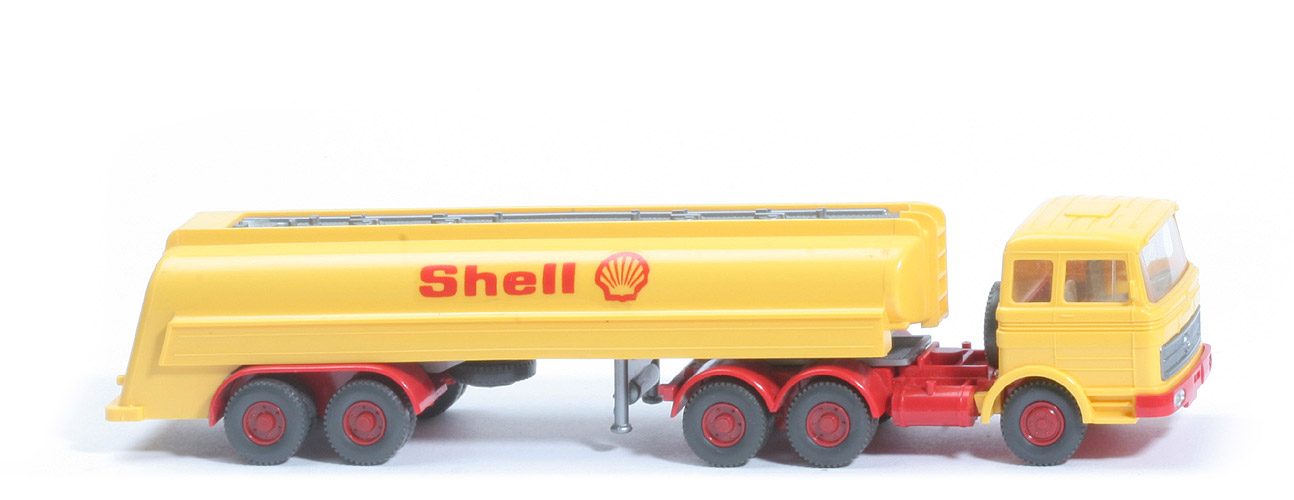 | Zugmaschine | Typ | Dach querversteift | Kabine | gelb | Spiegel, Lenkrad | mit | Verglasung | klar | Inneneinrichtung | ca. zementgrau | Stoßstange | rot, Scheinwerfer gesilbert | Chassis | rot | Halterung Pritsche | mit | Radlauf hinten | zweiteilig rot | Reserverad | hinter Kabine | Räder | Profil grob | Felgen | hellbraunrot | | Auflieger | Farbe | gelb | Leiter | nicht gesilbert | Farbe Chassis, Armaturen | silber | Beschriftung Seite | SHELL gemischt mit Muschel | Beschriftung Art | Abziehbild | Beschriftung Heck | neues Logo Muschel | Beschriftung Art | Abziehbild klein | DAA Farbe | rot | DAA Typ | Klemmplatte | Bodenprägung Chassis | nur Wiking | Königsbolzen | groß | Reserverad | gesteckt | Räder | Profil grob | Felgen | hellbraunrot |