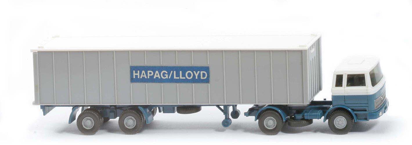 | Zugmaschine | Kabine oben | weiß | Kabine unten | azurblau | Streifen | ohne | Verglasung | getönt | Inneneinrichtung | ca. lichtgrau | Lenkrad | ohne | Grill | silbern | Stoßstange, Radlauf vorn | azurblau | Chassistyp | neu | Chassisfarbe | azurblau | Radlauf hinten | azurblau | Reserverad | unter Chassis | Sattelpfanne | für großen Königsbolzen | Räder | 12mm, Profil grob | Felgen | silbergrau | | Container | Art | 1 x 40 ft gerippt | Dach | weiß | Korpus | silbergrau | Türen | silbergrau | Beschriftung | Hapag-Lloyd (s. Foto) | Beschriftung Grösse | 5 Felder, Papieraufkleber | | Auflieger | Farbe | azurblau | Unterfahrschutz | ohne | Königsbolzen | stark | Räder | 12mm, Profil grob | Felgen | silbergrau |