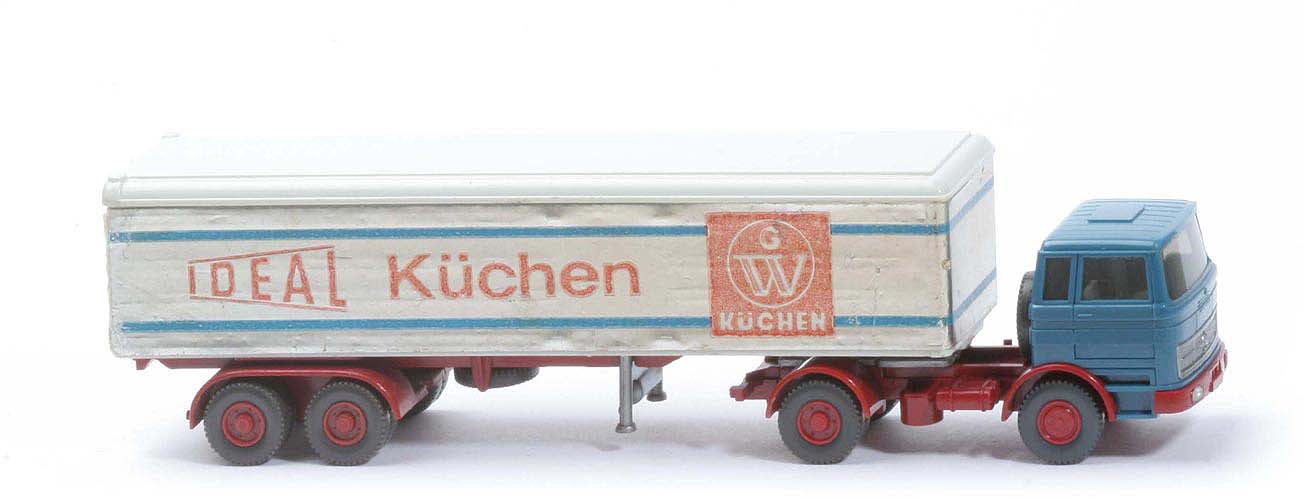 | Zugmaschine | Kabine oben | azurblau | Kabine unten | azurblau | Streifen | ohne | Verglasung | getönt | Inneneinrichtung | ca. lichtgrau | Lenkrad | ohne | Grill | silbern | Stoßstange, Radlauf vorn | hellbraunrot | Chassistyp | neu | Chassisfarbe | hellbraunrot | Radlauf hinten | hellbraunrot | Reserverad | hinter Kabine | Sattelpfanne | für großen Königsbolzen | Räder | 12mm, Profil grob | Felgen | hellbraunrot | Beschriftung Kabine | ohne | | Auflieger | Kofferdach | altweiß | Koffer Korpus | altweiß | Türen | altweiß | Kühlaggregat | ohne | Chassis | hellbraunrot | Achseinheit | hellbraunrot | Beschriftung Seite | GW Küchen (s. Foto) | Räder | 12mm, Profil grob | Felgen | hellbraunrot | Art aller Beschriftungen | gepolsterte Folie, umlaufend |