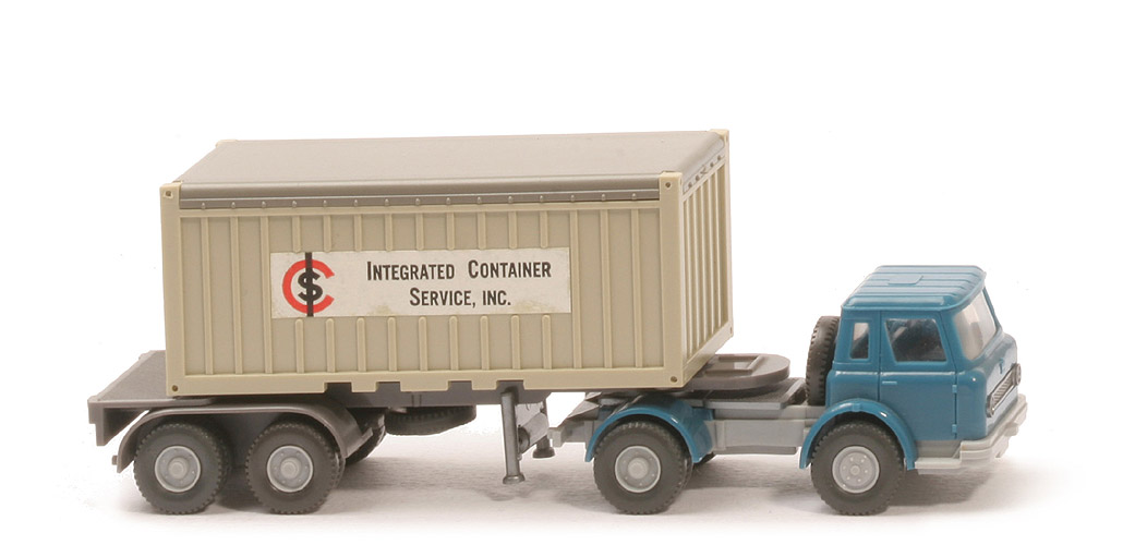| Zugmaschine | Kabine | azurblau | Lüfter | mit | Inneneinrichtung | azurblau | Verglasung | klar | Chassis | silbergrau | Radlauf hinten | azurblau | Sattelpfanne | für großen Königsbolzen | Reserverad | hinter Kabine | Räder | Profil grob | Felgen | silbergrau | | Container | Art | Open Top | Farbe Korpus | gelbgrau | Farbe Dach | steingrau | Beschriftung | ICS langer Aufkleber (s. Foto) | Beschriftung Art | Papieraufkleber, Druck schwarz/rot | | Auflieger | Farbe | basaltgrau | Variante | mit Markierung, mit Bohrungen neben KoBo | Reserverad | unter Auflieger, gesteckt | Bodenprägung | 52h | Doppelachsaggregat Farbe | basaltgrau | Doppelachsaggregat Typ | Klemmplatte WIKING u. GERMANY | Hydraulikstützen | silbern, gesteckt | Räder | Profil grob | Felgen | silbergrau |