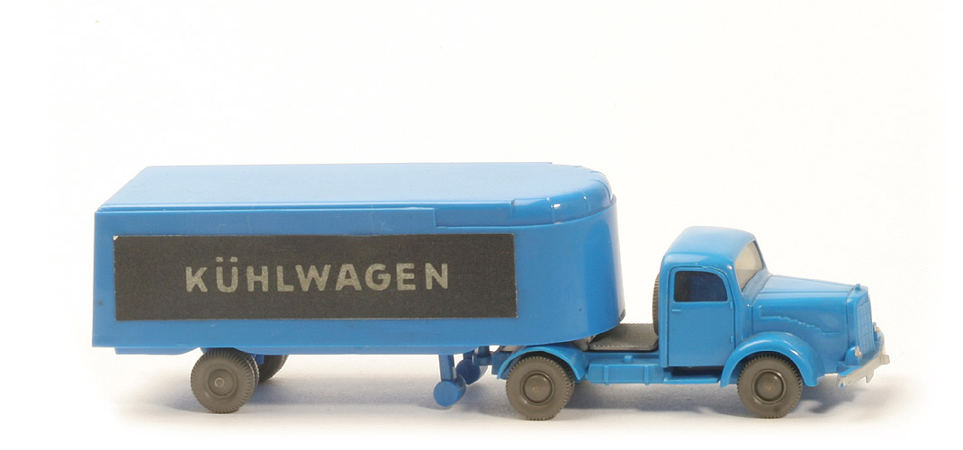 | | Zugmaschine | | Farbe Kabine | himmelblau | | Farbe Chassis | himmelblau | | Bemalung | Scheinwerfer, Stoßstange | | Sattelpfanne | alt, ohne Steg, für kleinen KöBo | | Achshalterungen | geschlossen | | Bodenprägung | WM (ohne Kreis) | | Reserverad | hinter Kabine | | Räder | neuere Ausführung | | | Auflieger | | Farbe Oberteil | himmelblau | | Farbe Unterteil | himmelblau | | Radlauf | ohne Kotflügel | | Bodenprägung | WM im Kreis | | Rückleuchten | ohne | | Dach | glänzend | | Aufkleberart | Papier, matt | | Beschriftung | Kühlwagen (s. Foto) | | Räder | 10 mm, ältere Ausführung |