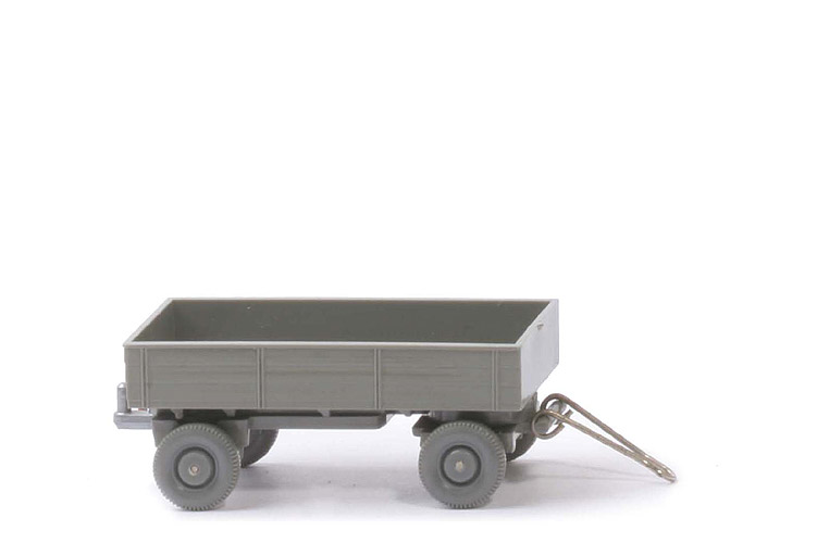 | Pritsche | Pritsche Farbe | betongrau | Pritschenseiten | Struktur | Pritscheneinlage | ohne | Kennzeichen hinten | zweiteilig | | Chassis | Chassis Farbe | betongrau | Chassis Variante | Typ 1 | Achshalterungen | geschlossen | Drehschemel | vernietet | Bodenprägung Drehschemel | ohne | Bodenprägung Chassis | ohne | Zughaken | silbern, eingesetzt in Chassisschlitz | | weitere Details | Deichsel | Metall | Bemalung Rückleuchten | rot | Bemalung Kennzeichen | silbern | Räder | 11mm, Glattwand |