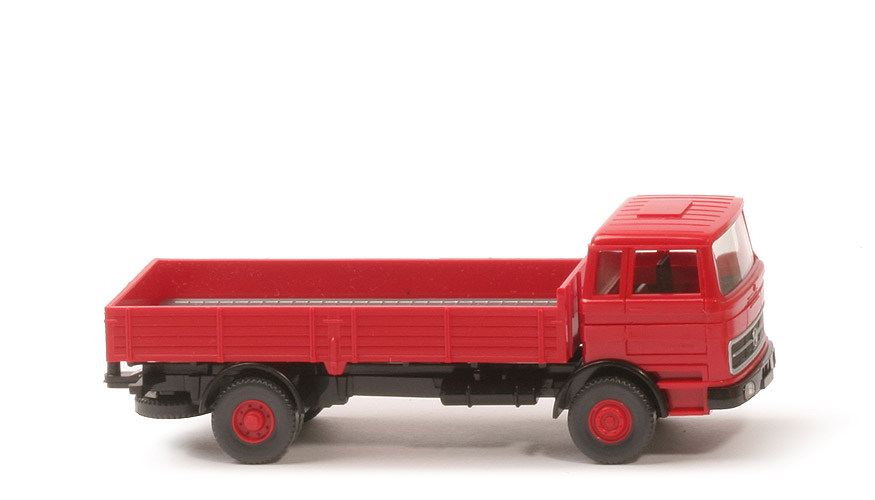 | Kabine oben | rot | | Kabine unten | rot | | Streifen | ohne | | Verglasung | klar | | Inneneinrichtung | schwarz | | Lenkrad | mit | | Stoßstange, Radlauf vorn | schwarz | | hier Aussparung | mit | | Chassistyp | BP WIKING, Germany | | Chassisfarbe | schwarz | | Radlauf hinten | schwarz | | Reserverad | gesteckt | | Pritsche | rot | | Pritschengestell | schwarz | | Pritscheneinlage | silber | | Plane | ohne | | Räder | 12mm, Felgen 10 Loch, rot |