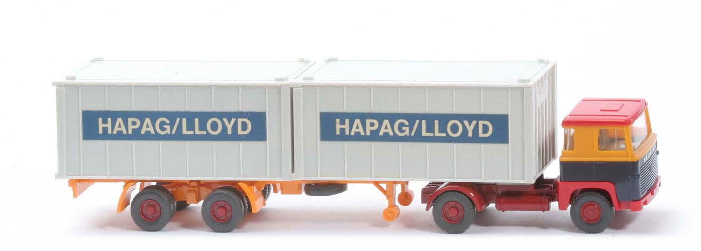 | | Zugmaschine | | Dach | rot | | Kabine oben | melonengelb | | Kabine unten | stahlblau | | Stoßstange | rot | | Frontbeschriftung | SCANIA schmal | | hier Farbhinterlegung | stahlblau | | Grill Prägung | mit 110 | | Scheinwerfer | in der Stoßstange ungesilbert | | Spiegel | ohne | | Scheibenwischer | ohne | | Lenkrad | ohne | | Sattelpfanne | für großen Königsbolzen | | Reserverad | unter Chassis | | Chassis Farbe | rubinrot | | Räder | 12mm, Profil grob | | Felgen | hellbraunrot | | | Container | | Art | 2 x 20 ft gerippt | | Dach | altweiß | | Korpus | altweiß | | Türen | altweiß | | Beschriftung | HAPAG... ( s. Foto) | | Breite | 7 Felder, Aufkleber | | | Auflieger | | Farbe | orangegelb (wie Serie) | | Unterfahrschutz | ohne | | Königsbolzen | stark | | Räder | 12mm, Profil grob | | Felgen | hellbraunrot |