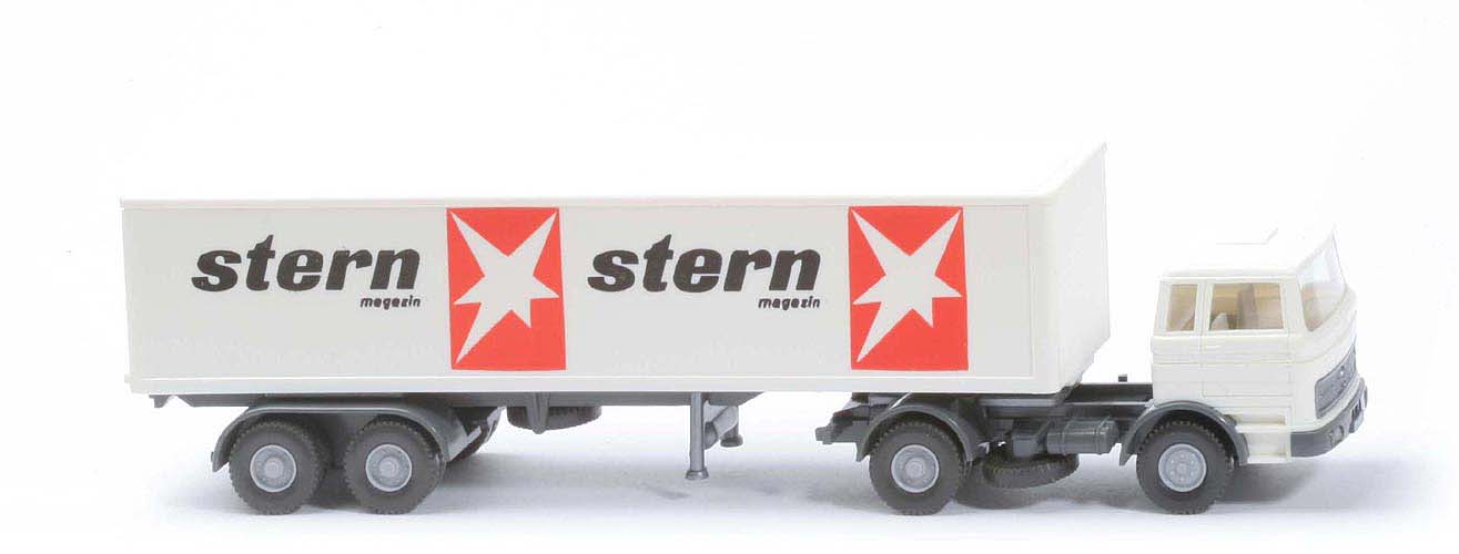 | Zugmaschine | Kabine oben | hellcremeweiß | Kabine unten | hellcremeweiß | Streifen | ohne | Verglasung | klar | Inneneinrichtung | ca. lichtgrau | Lenkrad | ohne | Grill | silbern | Stoßstange, Radlauf vorn | basaltgrau | Chassistyp | neu | Chassisfarbe | basaltgrau | Radlauf hinten | basaltgrau | Reserverad | unter Chassis | Sattelpfanne | für großen Königsbolzen | Räder | 12mm, Profil grob | Felgen | silbergrau | | Auflieger | Kofferdach | hellcremeweiß | Koffer Korpus | hellcremeweiß | Türen | hellcremeweiß | Oberfläche Seiten | halbmatt | Chassis | basaltgrau | Achseinheit | basaltgrau | Beschriftung Seite | Stern (s. Foto) | Räder | 12mm, Profil grob | Felgen | silbergrau | Art der Beschriftung | satter Druck | Druckbild | matt |