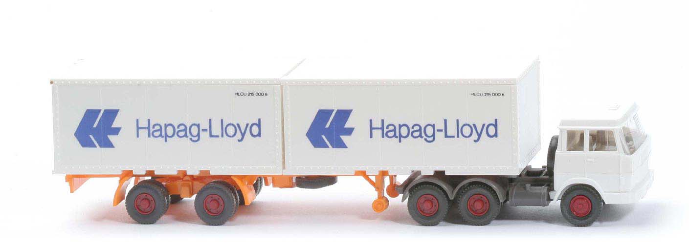 | | Zugmaschine | | Kabine oben | weiß | | Kabine unten | weiß | | Verglasung | klar | | Inneneinrichtung | ca. hellolivgrau | | Lenkrad | mit | | Chassis | basaltgrau | | Radlauf hinten | basaltgrau | | Sattelpfanne | für großen Königsbolzen | | Reserverad | hinter Kabine | | Räder | Profil grob | | Felgen | hellbraunrot | | | Container | | Art | 2 x 20 ft neu | | Farbe | weiß | | Türen | alt | | Beschriftung | Hapag-Lloyd (s. Foto) | | Beschriftung Art | 36mm, mit Nummer (Serie) | | | Auflieger | | Farbe | orangegelb (wie Serie) | | Unterfahrschutz | ohne | | Königsbolzen | stark | | Räder | Profil grob | | Felgen | hellbraunrot |