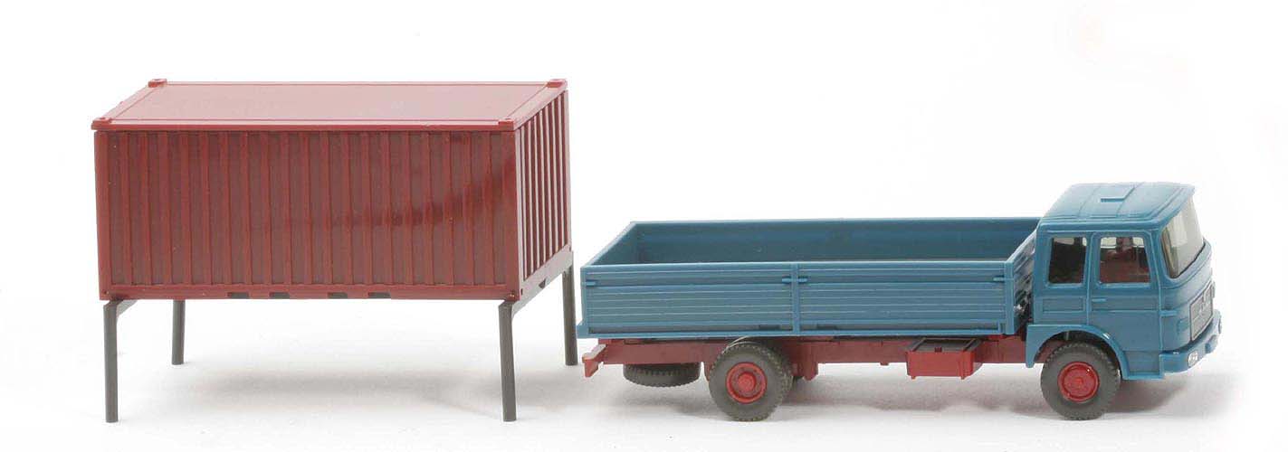 Fahrerhaus | azurblau | Verglasung | getönt | Inneneinrichtung | ohne Lenkrad | Spiegel | keine | Scheibenwischer | keine | Lüftergitter | mit | Grill | silbern, ohne Löwe | Motorblock | silbern | Chassis | hellbraunrot | Räder | 12mm, Profil grob | Felgen | silbergrau | | Pritsche | Farbe | azurblau | Pritscheneinlage | silbern | | Container | Farbe | braunrot | Aussparung | ohne | | Ständer | Farbe | anthrazit |