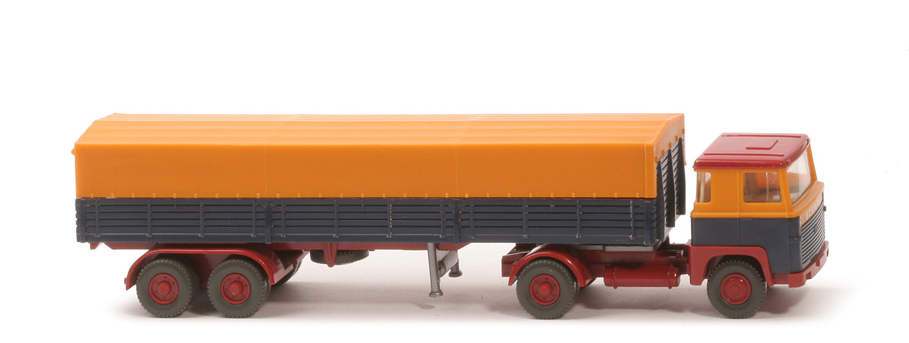 | Zugmaschine | Dach | rubinrot | Kabine oben | melonengelb | Kabine unten | stahlblau | Stoßstange | rubinrot | Frontbeschriftung | SCANIA schmal | hier Farbhinterlegung | melonengelb | Grill Prägung | mit 110 | Scheinwerfer | in der Stoßstange ungesilbert | Spiegel | ohne | Scheibenwischer | ohne | Lenkrad | ohne | Sattelpfanne | für großen Königsbolzen | Reserverad | ohne | Chassis Farbe | rubinrot | Rücklichtstangen | ohne | Räder | 12mm, Profil grob | Felgen | hellbraunrot | | Auflieger | Farbe Pritsche | stahlblau | Pritschentyp | Holzpritsche mit Lasche | Chassis | rubinrot | Pritscheneinlage | lichtgrau | Achseinheit | rubinrot | Bodenprägung Achseinheit | Germany/ Wiking | Reserverad | ja | Stütze | starr, Stempel silbern | Plane | melonengelb | Plane Art | Seite 2 Mark., vorne geschl. | Beschriftung | keine |