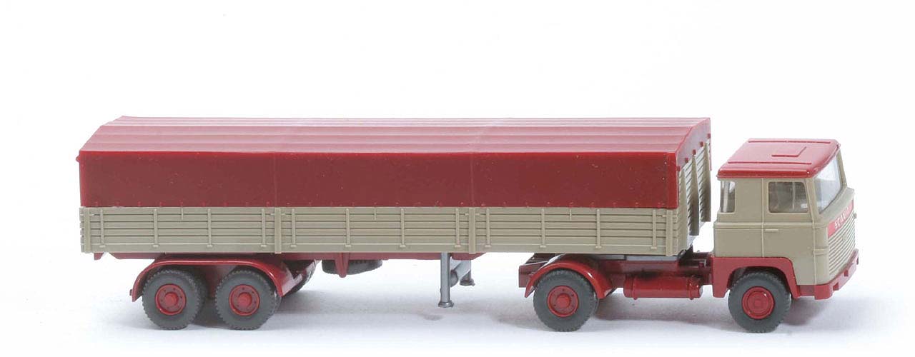 | Zugmaschine | Dach | rubinrot | Kabine oben | gelbgrau | Kabine unten | gelbgrau | Stoßstange | rubinrot | Frontbeschriftung | SCANIA schmal | hier Farbhinterlegung | hellbraunrot | Grill Prägung | mit 110 | Scheinwerfer | in der Stoßstange ungesilbert | Spiegel | ohne | Scheibenwischer | ohne | Lenkrad | ohne | Sattelpfanne | für großen Königsbolzen | Reserverad | ohne | Chassis Farbe | rubinrot | Rücklichtstangen | ohne | Räder | 12mm, Profil grob | Felgen | hellbraunrot | | Auflieger | Farbe Pritsche | gelbgrau | Pritschentyp | Holzpritsche mit Lasche | Chassis | weinrot | Pritscheneinlage | olivgrau | Achseinheit | rubinrot | Bodenprägung Achseinheit | Germany/ Wiking | Reserverad | ja | Stütze | starr, Stempel silbern | Plane | weinrot | Plane Art | Seite 2 Mark., vorne geschl. | Beschriftung | keine |