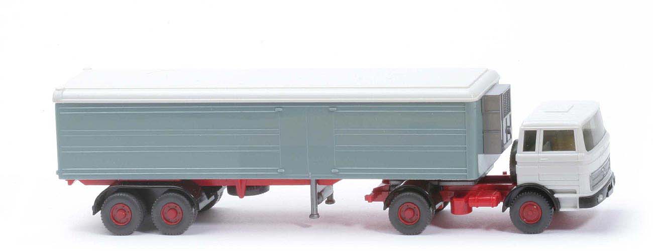 | Zugmaschine | Kabine oben | altweiß | Kabine unten | altweiß | Streifen | ohne | Verglasung | getönt | Inneneinrichtung | ca. betongrau | Lenkrad | ohne | Grill | silbern | Stoßstange, Radlauf vorn | schwarz | Chassistyp | neu | Chassisfarbe | rot | Radlauf hinten | schwarz | Reserverad | hinter Kabine | Sattelpfanne | für großen Königsbolzen | Räder | 12mm, Profil grob | Felgen | hellbraunrot | Beschriftung Kabine | ohne | | Auflieger | Kofferdach | altweiß | Koffer Korpus | hellblaugrau | Türen | altweiß | Kühlaggregat | mit | Chassis | rot | Achseinheit | schwarz | Beschriftung Seite | ohne | Räder | 12mm, Profil grob | Felgen | hellbraunrot |