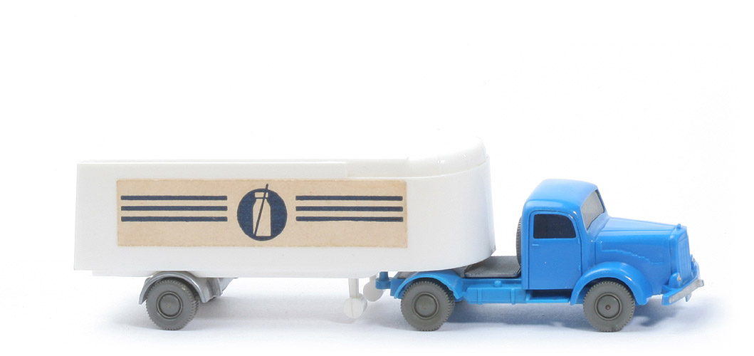 | Zugmaschine | Farbe Kabine | himmelblau | Farbe Chassis | lichtblau!!! | Bemalung | Scheinwerfer, Stoßstange | Sattelpfanne | alt, ohne Steg, für kleinen KöBo | Achshalterungen | geschlossen | Bodenprägung | WM (ohne Kreis) | Reserverad | hinter Kabine | Räder | neuere Ausführung | | Auflieger | Farbe Oberteil | weiß | Farbe Unterteil | weiß | Radlauf | mit Kotflügel silber | Bodenprägung | WM (ohne Kreis) | Rückleuchten | mit | Dach | glänzend | Aufkleberart | Papier, matt | Beschriftung | Milchsymbol, Kanne - weiß | Räder | neuere Ausführung |