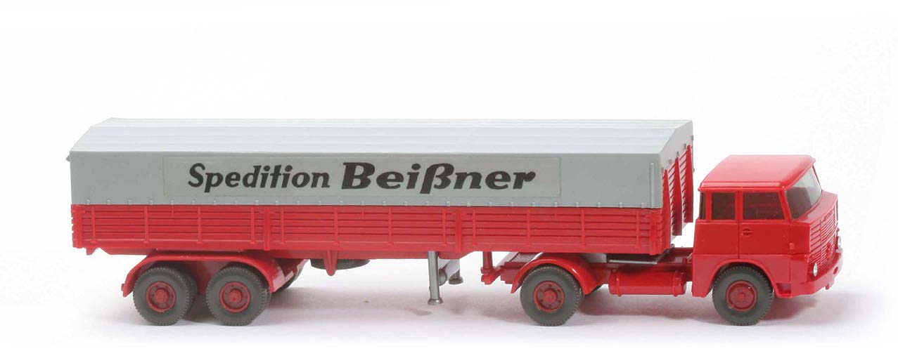 | Zugmaschine | Kabine oben | rot | Kabine unten | rot | Verglasung | getönt | Stege für Inneneinrichtung | nein | Chassistyp | alt | Zughaken | mit | Fläche hinter Sattelpfanne | geriffelt | Chassisfarbe | rot | Sattelpfanne | alt, mit Steg, für kleinen KöBo | Reserverad | ohne | Räder | 12mm, Profil fein | Felgen | hellbraunrot | | Auflieger | Farbe Pritsche | rot | Pritschentyp | ohne Lasche | Chassis | rot | Prägung Chassis | Wiking | Pritscheneinlage | silber | Achseinheit | rot | Typ Achseinheit | Germany/Wiking | Königsbolzen | dünn, integriert | Plane | Seite glatt., vorne Aussp | Plane Farbe | silbergrau | Räder | 12mm, Profil fein | Felgen | hellbraunrot | Beschriftung | Spedition Beißner (s. Foto) | Beschriftung Art | klare glänzende Folie |