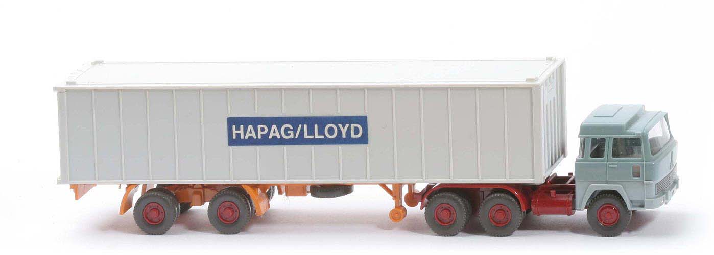 | | Zugmaschine | | Kabine oben | grünblau | | Kabine unten | hellblaugrau | | Verglasung | klar | | Inneneinrichtung | ca. lichtgrau | | Lenkrad | ohne | | Grill | silber | | Chassis | hellbraunrot | | Radlauf hinten | hellbraunrot | | Sattelpfanne | für großen Königsbolzen | | Reserverad | ohne | | Räder | Profil grob | | Felgen | hellbraunrot | | | Container | | Art | 1 x 40 ft gerippt | | Dach | altweiß | | Korpus | altweiß | | Türen | altweiß | | Unterkante | breit | | Beschriftung | Hapag-Lloyd (s. Foto) | | Beschriftung Grösse | 5 Felder, Papieraufkleber | | | Auflieger | | Farbe | gelborange (Werbe) | | Unterfahrschutz | ohne | | Königsbolzen | stark | | Räder | Profil grob | | Felgen | hellbraunrot |