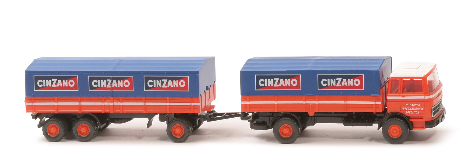 | Zugwagen | Kabine oben | orange, Dach weiß bedruckt | Kabine unten | orange | Streifen | weiß | Verglasung | klar | Inneneinrichtung | rot | Lenkrad | integriert | Grill, Stoßstange, Radlauf vor | schwarz | hier Aussparung | mit | Chassistyp | Neuauflage: neues WIKING-Logo, aber noch dicker Zughaken | Chassisfarbe | schwarz | Radlauf hinten | schwarz | Reserverad | gesteckt | Pritsche | orange | Pritschengestell | schwarz | Pritscheneinlage | silber | Plane | maritimblau | Räder | 12mm, Felgen 8-Loch, orange | Beschriftung | CinZano ... (s.Foto) | | Anhänger | Pritsche | orange | Pritscheneinlage | silbern | Chassisfarbe | schwarz | Hinterachsaufhängung | für Doppelbereifung | Bodenprägung | neues WIKING-Logo | Drehschemel | schwarz, BP 40 d | Reserverad | mittig unter Chassis gesteckt | Deichsel | schwarz, Öse groß | Plane | maritimblau | Räder | 12mm, Felgen 8-Loch, orange | Beschriftung | CinZano ... (s.Foto) |