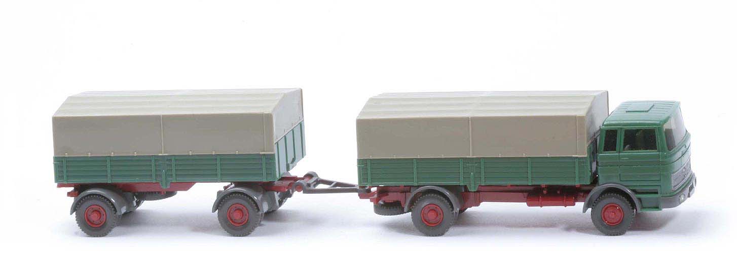 | Zugwagen | Kabine oben | helles kieferngrün | Kabine unten | helles kieferngrün | Streifen | ohne | Verglasung | getönt | Inneneinrichtung | ca. hellgelbgrau | Lenkrad | ohne | Stoßstange, Radlauf vorn | basaltgrau | hier Aussparung | mit | Chassistyp | Zughaken verstärkt | Chassisfarbe | hellbraunrot | Radlauf hinten | basaltgrau | Reserverad | gesteckt | Pritsche | helles kieferngrün | Pritschengestell | hellbraunrot | Pritscheneinlage | silber | Plane | olivgrau | Räder | 12mm, Profil grob | Felgen | hellbraunrot | | Anhänger | Pritsche | helles kieferngrün | Chassis | hellbraunrot | Kotflügel | basaltgrau | Deichsel | Kunststoff | Reserverad | mittig unter Chassis | Pritscheneinlage | silbern | Plane | olivgrau | Räder | 12mm, Profil grob | Felgen | hellbraunrot |