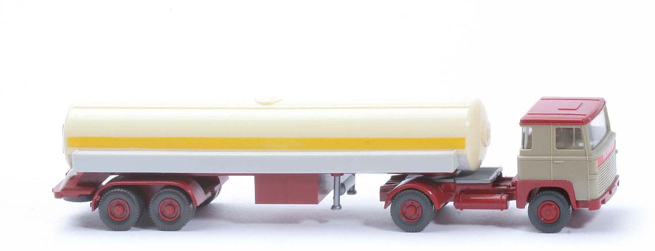 | | Zugmaschine | | Dach | hellbraunrot | | Kabine oben | gelbgrau | | Kabine unten | gelbgrau | | Stoßstange | hellbraunrot | | Frontbeschriftung | SCANIA schmal | | hier Farbhinterlegung | rot | | Grill Prägung | mit 110 | | Scheinwerfer | in der Stoßstange, ungesilber | | Spiegel | ohne | | Scheibenwischer | ohne | | Lenkrad | ohne | | Sattelpfanne | für großen Königsbolzen | | Reserverad | ohne | | Chassis Farbe | hellbraunrot | | Rücklichtstangen | ohne | | Räder | 12mm, Profil grob | | Felgen | hellbraunrot | | | Auflieger | | Tank | creme | | Galerie | altweiß | | Chassis | hellbraunrot | | Achseinheit | hellbraunrot | | Stütze | Hydraulikstempel, silber | | Reserverad | hinter Achseinheit | | Beschriftung Heck | Frigen | | Beschriftung Art | Papieraufkleber | | gelber Streifen | mit | | Räder | 12mm, Profil grob | | Felgen | hellbraunrot |