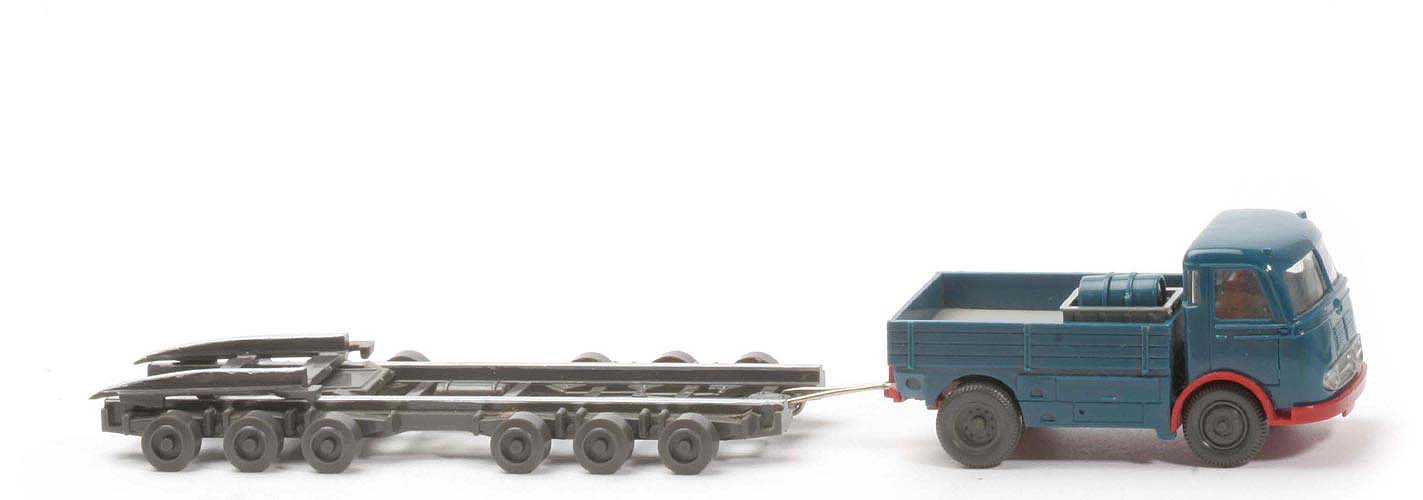 | Zugmaschine | Kabine Farbe | ozeanblau | Fenstersteg | breit | Fixierung Reserverad | mit | Verglasung | klar | Inneneinrichtung | hellbraunrot | Grill | silbern eingesetzt | Chassis | hellbraunrot | Bodenprägung | WM, Made in Germany | hintere Stoßstange links | mit | Zughaken | mit | hintere Stoßstange rechts | mit | Pritsche | ozeanblau | Pritscheneinlage -Typ | 4-geteilt | Pritscheneinlage - Farbe | lichtgrau | Räder | 10-Loch, anthrazit | Ladegut | Kasten mit ozeanblauer Tonne lose | | Anhänger | Farbe | anthrazit | Bodenprägung | WM im Kreis, 59 und Wiking Germany | Bremsplatte | Fläche mit Randgravur | Bemalung | Gleise silbern | Deichsel | Metall | Räder | Walzenräder, 7,8mm o. Profil | Farbe Räder | anthrazit |