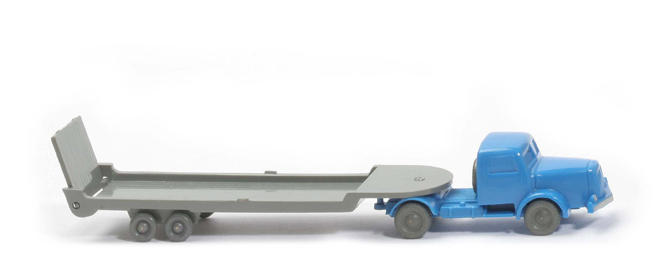 Achsen | Rollachser | | Zugmaschine | Farbe Kabine | himmelblau | Farbe Chassis | himmelblau | Bemalung | Scheinwerfer, Stoßstange | Sattelpfanne | eingesetzt, in Chassisfarbe | Chassis | Version 1a | Achshalterungen | geschlossen | Bodenprägung | WM (ohne Kreis) | Reserverad | hinter Kabine | Räder | 10 mm, Profil, hellgrau | | Auflieger | Achsen | Rollachser | Farbe | betongrau | Typ | vorn rund (Typ 1) | Seilwinde | ohne | Fläche über Drehschemel | mit Prägung WM im Kreis | Rückleuchten | ohne | Rampe | kurz | Stützen | ohne | Bodenprägung | ohne | Königsbolzen | kurz | Räder | 7mm, o. Profil, hellgrau |