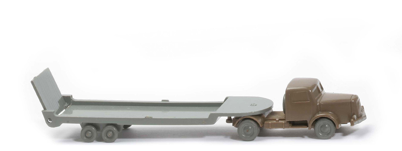 Achsen | Rollachser | | Zugmaschine | Farbe Kabine | blassbraun | Farbe Chassis | blassbraun | Bemalung | Scheinwerfer, Stoßstange | Sattelpfanne | eingesetzt, in Chassisfarbe | Chassis | Version 1a | Achshalterungen | geschlossen | Bodenprägung | WM (ohne Kreis) | Reserverad | hinter Kabine | Räder | 10 mm, Profil, hellgrau | | Auflieger | Achsen | Rollachser | Farbe | betongrau | Typ | vorn rund (Typ 1) | Seilwinde | ohne | Fläche über Drehschemel | mit Prägung WM im Kreis | Rückleuchten | ohne | Rampe | kurz | Stützen | ohne | Bodenprägung | ohne | Königsbolzen | kurz | Räder | 7mm, o. Profil, hellgrau |