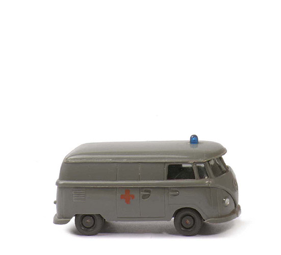 Farbe Karosserie oben | betongrau | Farbe Karosserie unten | betongrau | Heckscheibe | klein | Chassis | Teil des Karosserieunterteils | Chassis Version | Typ A Nest 2 | Bodenprägung | Made in Germany, WM | Rückleuchten | gering erhaben | Mittelholm | oben gerade | Verglasung | Typ 3, getönt, eine Bohrung | Inneneinrichtung | ohne | Dachaufbau | ohne | Blaulicht | auf dem Dach verklebt | Rotes Kreuz | Druck rot | Bemalung Scheinwerfer | silbern | Bemalung VW-Emblem | ohne | Bemalung Stoßstangen | ohne | Bemalung Kennzeichen hinten | ohne | Bemalung Rückleuchten | ohne | Räder | 8 mm, ca. lichtgrau, Nabe gewölbt |