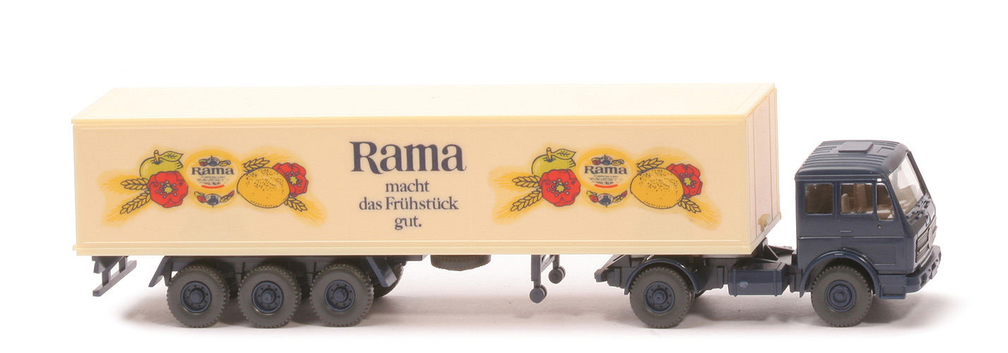 | Zugmaschine | Kabine | stahlblau | eingesetzter Grill | schwarz, mit Streifen | Lüfter | hoch | Heckfenster | offen (Serie: geschlossen) | Spiegelaufnahmen | mit | Inneneinrichtung | ca. hellolivgrau | Stoßstange | stahlblau | Chassis | stahlblau | Radlauf hinten | stahlblau | Reserverad | ohne | Räder | Profil grob | Felgen | 10-Loch, stahlblau | | Auflieger | Farbe Dach | cremeweiß | Farbe Korpus | cremeweiß | Türen | cremeweiß | Beschriftung | Rama, Stillleben | Beschriftung Art | Rama ... als Druck, Stillleben als Abziehbild | Auflieger | stahlblau | 3-Achsaggregat Farbe | stahlblau | Unterfahrschutz | mit | Königsbolzen | stark | Räder | Profil grob | Felgen | 10-Loch, stahlblau |