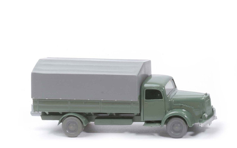 Farbe Kabine | dunkelresedagrün | Version Kabine | ohne Schlitz hinter Nrn-Schild | Blinker | ohne | Verglasung | getönt | Bemalung | Scheinwerfer, Stoßstange | Chassis Farbe | dunkelresedagrün | Chassis Art | Version 2 | Achshalterungen | geschlossen | Chassis Bodenprägung | WM ohne Kreis | Zughaken | silbern, im Kipperschlitz | Rückleuchten am Chassis | ohne | Pritsche Art | Normpritsche | Pritschenseiten | waagerechte Gravuren | Rückleuchten | eingerückt | Kennzeichen | zweiteilig | Pritsche Farbe | dunkelresedagrün | Pritscheneinlage | ohne | Bemalung Rückleuchten | rot | Bemalung Kennzeichen | unten silbern | Plane | geschlossen, staubgrau | Räder | 10mm, ältere Version |