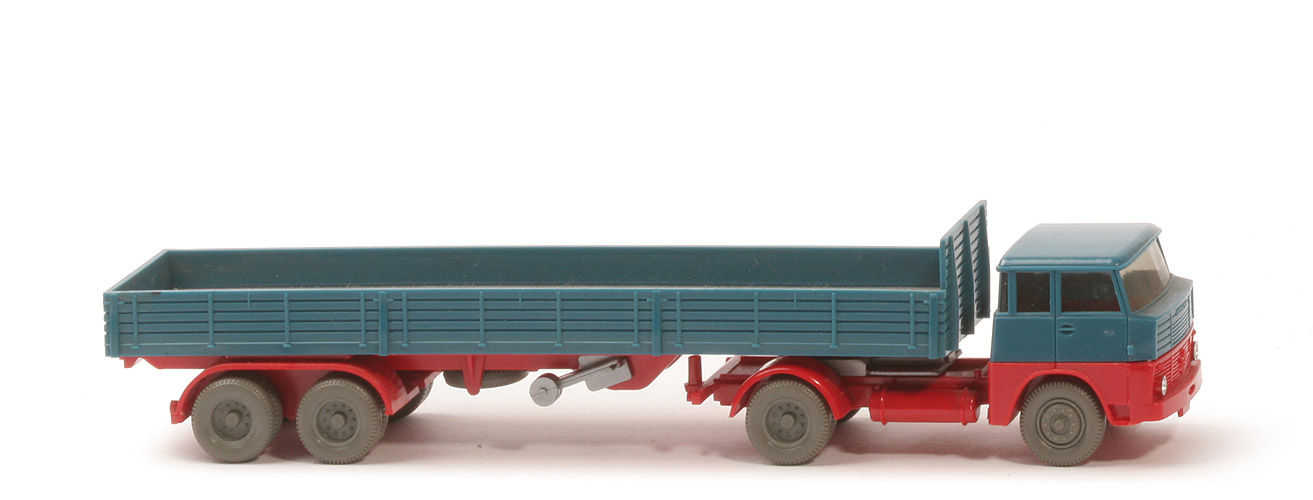| | Zugmaschine | | Kabine oben | azurblau | | Kabine unten | rot | | Verglasung | getönt | | Stege für Inneneinrichtung | nein | | Chassistyp | alt | | Zughaken | mit | | Fläche hinter Sattelpfanne | geriffelt | | Chassisfarbe | rot | | Sattelpfanne | alt, mit Steg, für kleinen KöBo | | Reserverad | ohne | | Räder | einteilig hellgrau | | | Auflieger | | Farbe Pritsche | azurblau | | Pritschentyp | ohne Lasche | | Chassis | rot | | Prägung Chassis | Wiking - mit 51 h | | Pritscheneinlage | silber | | Achseinheit | rot | | Typ Achseinheit | Made in Germany 2a | | Königsbolzen | dünn, eckig, eingeklebt | | Stütze | beweglich, Halterung verstärkt | | Plane | ohne | | Räder | einteilig hellgrau |