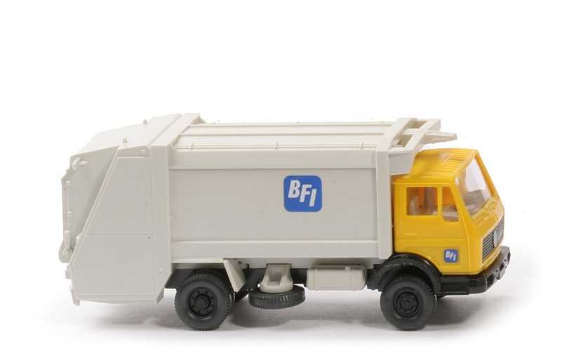 Kabine | gelb | Spiegelaufnahmen | ohne | Grill | schwarz | Grillbedruckung | nur Stern | Inneneinrichtung mit Lenkrad | ca. zementgrau | Kotflügel | schwarz mit Wulst | Chassis | schwarz | Bodenprägung | WIKING BERLIN-W | Aufbau | grauweiß | Unterbau | grauweiß | Warnbaken Heck | ohne | Beschriftung | BFI, auch auf Tür | Bemalung | ohne | Räder | 11 mm | Felgen | eingesetzt, schwarz, 8 Loch |