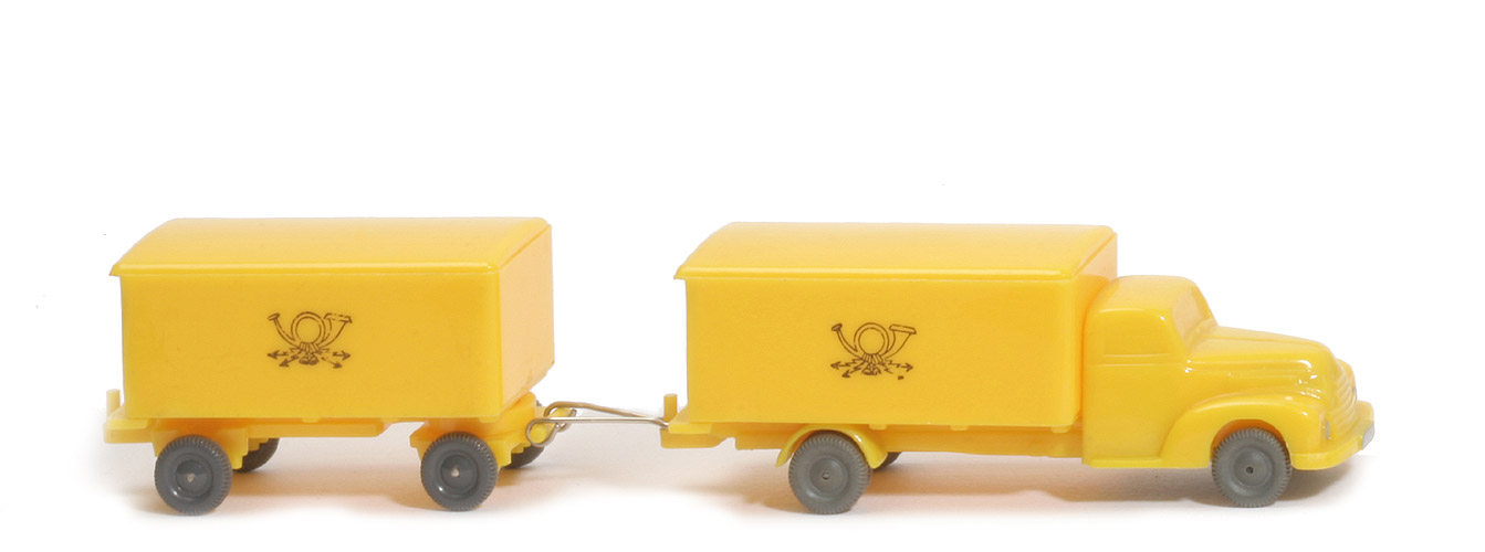 | Achsen | Rollachser | | Farbe Kabine u. Chassis | gelb | | Kabinenboden | Platte silbern | | Bodenplatte Prägung | WM im Kreis | | Bemalung Kabine | Scheinwerfer, Kennzeichen silbern | | Koffer Typ | flacher Koffer Typ 1a | | Farbe Koffer | gelb | | Farbe Dach | gelb | | Farbe Türen | gelb | | Beschriftung | spätes großes Horn | | Beschriftung Art | Druck | | Kennzeichen am Koffer | silbern bemalt | | Räder | 10mm, mit Profil |