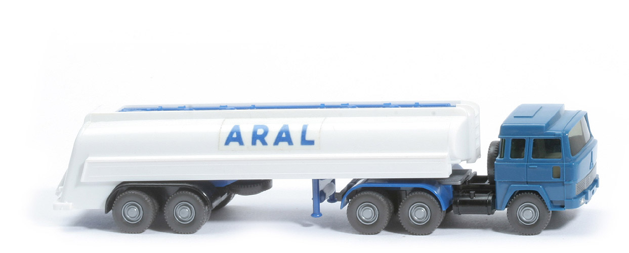 | Zugmaschine | Kabine oben | kobaltblau | Kabine unten | kobaltblau | Verglasung | getönt | Inneneinrichtung | ca. hellgelbgrau | Lenkrad | ohne | Grill | silber | Chassis | schwarz | Radlauf hinten | kobaltblau | Sattelpfanne | für großen Königsbolzen | Reserverad | hinter Kabine | Räder | Profil grob | Radkappen | silber | | Auflieger | Farbe Tank | weiß | Farbe Füllanlage | helles kobaltblau | Farbe Armaturen hinter Klappe | helles kobaltblau | Farbe Chassis | helles kobaltblau | Beschriftung Seite | Aral | Beschriftung Heck | Aral | Beschriftung - Art | Folien | Achseinheit - Farbe | schwarz (!) | Typ Achseinheit | Germany/Wiking | Bodenprägung Chassis | Wiking, ohne 80 S | Königsbolzen | groß | Reserverad | mit | Räder | Profil grob | Radkappen | silber |