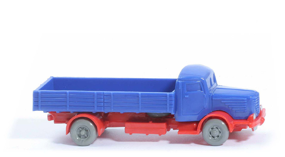 Achsen | Rollachser | Kabine Farbe und Pritsche | dunkelultramarin | Blinker | ohne | Bemalung Scheinwerfer | silbern | Bemalung Kennzeichen | silbern | Positionsleuchten | ohne | Warndreieck | ohne | Pritschenboden | glatt, WM im Kreis | Pritschenrückseite | nur drei senkrechte Streben | Chassis | Version 1 | Chassis Farbe | orangerot | Chassis Bereich Trittbretter | offen | Bodenprägung Verteilergetriebe | ohne | hintere Achshalterung | geschlossen | Auspuff | zur Fahrerseite | Zughaken | angedeutete Kupplung | Rücklichtstange Beifahrerseite | ohne | Bodenprägung hinten | ohne | Reserverad | vorne unter Pritsche | Bemalung Kennzeichen | silbern | Rückleuchte | ohne | Plane | immer ohne | Räder | Trilex ohne Profil hellgrau |