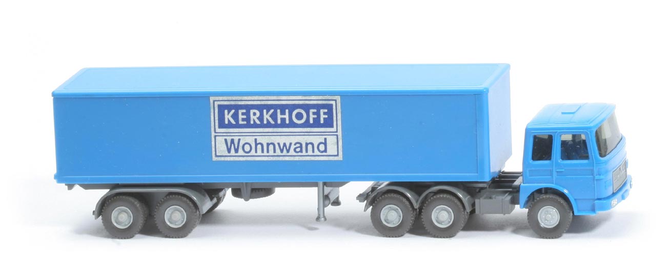 | | Zugmaschine | | Fahrerhaus | signalblau | | Verglasung | getönt | | Inneneinrichtung | azurblau | | Spiegel | keine | | Scheibenwischer | keine | | Lüftergitter | mit | | Grill | silbern, ohne Löwe | | Motorblock | silbern | | Chassis | staubgrau | | Radlauf hinten | 2-teilig, staubgrau | | Räder | 12mm, Profil grob | | Felgen | silbergrau | | Blinklicht | ohne | | | Auflieger | | Kofferdach | signalblau | | Koffer Korpus | signalblau | | Türen | signalblau | | Oberfläche Seiten | matt | | Chassis | staubgrau | | Achseinheit | staubgrau | | Beschriftung Seite | KERKHOFF (s. Foto) | | Art der Beschriftung | Papieraufkleber, matt | | Räder | 12mm, Profil grob | | Felgen | silbergrau |