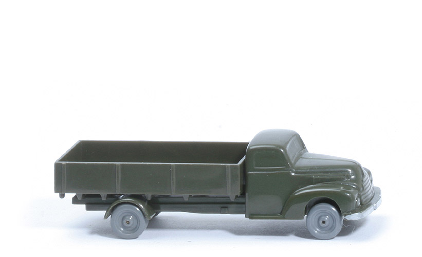 Achsen | Rollachser | Farbe Kabine u. Chassis | olivgrün | Kabinenboden | offen, WM im Kreis | Bemalung Kabine | Scheinwerfer, Stoßstange | Pritsche | Seiten glatt | Farbe Pritsche | olivgrün | Zughaken | nach unten | Zapfen | Rundzapfen | Befestigung Pritsche | nur gesteckt | Räder | 10mm, ohne Profil |