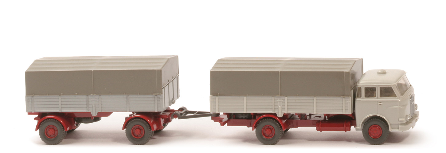 | Pritschenwagen | Fahrerhaus | achatgrau | Verglasung | klar | Sitze | hellgelbgrau | Grill | silbern | Scheinwerfer | silbern | Chassis | hellbraunrot | Pritsche | achatgrau | Reserverad | unter Pritsche, hinten, 11mm | Pritscheneinlage | silbern | Zughaken | Dreieck | Plane | betongrau | Räder | Profil grob 12mm | Felgen | hellbraunrot | | Anhänger | Pritsche | silbergrau | Chassis | hellbraunrot | Deichsel | Kunststoff | Reserverad | mittig unter Chassis | Räder | Profil grob 12mm | Felgen | hellbraunrot | Plane | betongrau |