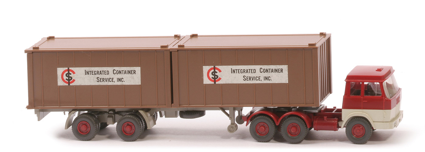 | Zugmaschine | Kabine oben | hellbraunrot | Kabine unten | perlweiß | Verglasung | klar | Inneneinrichtung | 2 Sitze, Motorblock, schokobraun | Lenkrad | ohne | Chassis | hellbraunrot | Radlauf hinten | hellbraunrot, 2-teilig | Sattelpfanne | für großen Königsbolzen | Reserverad | ohne | Räder | Profil grob | Felgen | hellbraunrot | | Container | Art | 2 x 20 ft gerippt | Farbe | lehmbraun | Beschriftung | ICS (s. Foto) | Beschriftung Art | 5 Felder, Papieraufkleber | | Auflieger | Farbe | olivgrau | Unterfahrschutz | ohne | Königsbolzen | stark | Räder | Profil grob | Felgen | hellbraunrot |