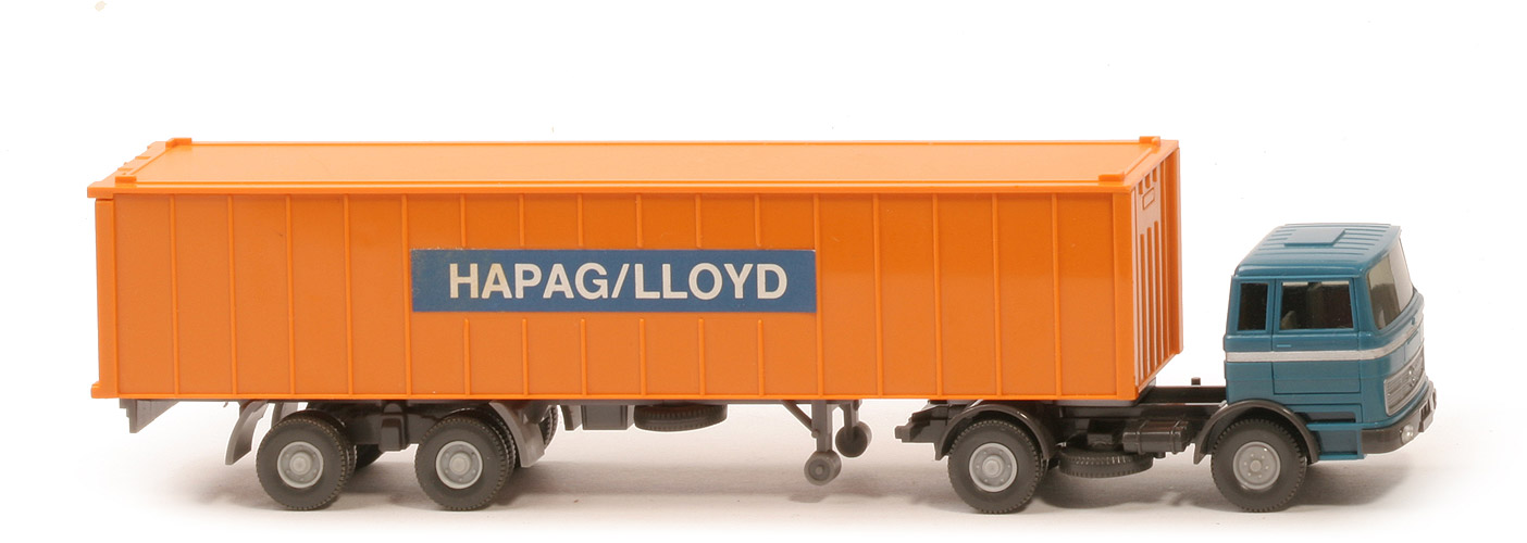 | Zugmaschine | Kabine oben | azurblau | Kabine unten | azurblau | Streifen | mit | Verglasung | getönt | Inneneinrichtung | ca. hellgelbgrau | Grill | silbern | Stoßstange, Radlauf vorn | anthrazit | Chassistyp | alt | Chassisfarbe | anthrazit | Radlauf hinten | anthrazit | Reserverad | unter Chassis | Sattelpfanne | neu, für dünnen Bolzen | Räder | 12mm, Profil fein | Felgen | silbergrau | | Container | Art | 1 x 40 ft gerippt | Dach | gelborange | Korpus | gelborange | Türen | gelborange | Unterkante | schmal | Beschriftung | Hapag-Lloyd (s. Foto) | Beschriftung Größe | 7 Felder, Papieraufkleber | | Auflieger | Farbe | basaltgrau | Unterfahrschutz | ohne | Königsbolzen | dünn | Räder | 12mm, Profil fein | Felgen | silbergrau |