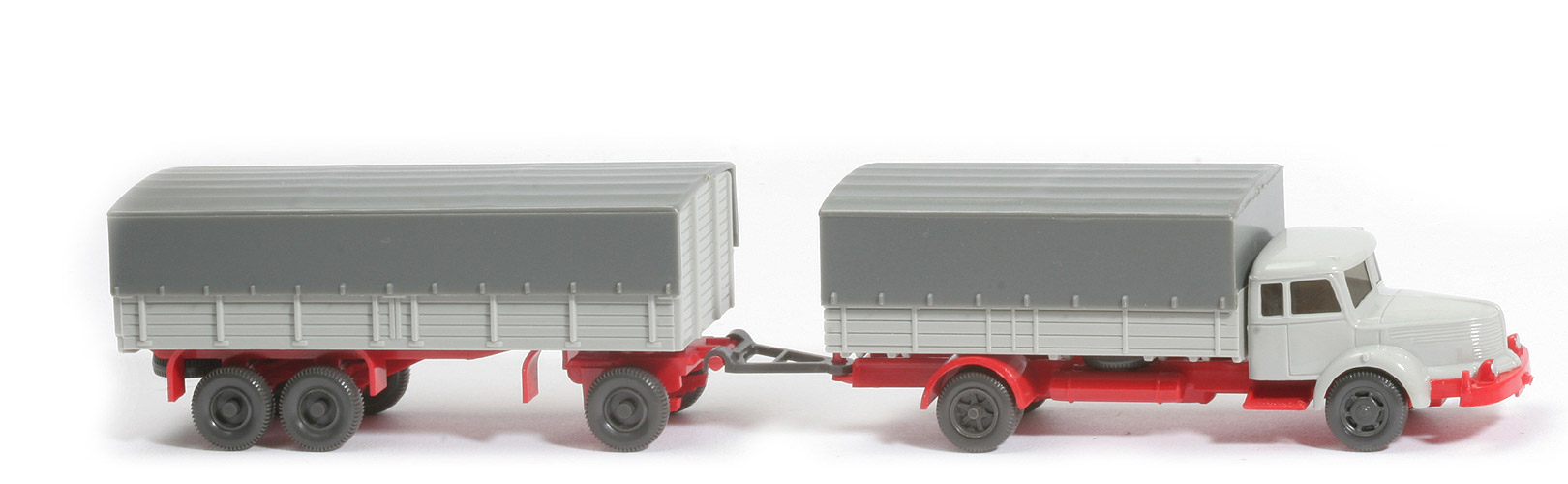 Dies ist eine recht seltene Variante: Offensichtlich ganz kurz bevor der TITAN aus dem Programm genommen wurde, ist eine Änderung der Bodenprägung von "WM" in "WIKING GERMANY" vorgenommen worden. Diese Bodenprägung findet sich bei dem 10 Jahre späteren Veteran wieder. Die Trittbretter sind jedoch von unten noch glatt und das Reserverad ist noch nicht durch Stifte fixiert. Hier mit passendem Hänger 481/5b. |