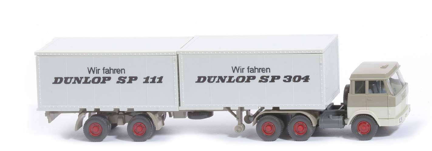 | Zugmaschine | Kabine oben | olivgrau | Kabine unten | perlweiß | Verglasung | getönt | Inneneinrichtung | 3 Sitze, ca. blaugrau | Lenkrad | ohne | Chassis | basaltgrau | Radlauf hinten | olivgrau, einteilig | Sattelpfanne | für großen Königsbolzen | Reserverad | hinter Kabine | Räder | Profil grob | Felgen | hellbraunrot | | Container | Art | 2 x 20 ft Glattwand | Farbe | altweiß | Beschriftung | Dunlop ... (s. Foto) | Beschriftung Art | Druck schwarz | | Auflieger | Farbe | olivgrau | Unterfahrschutz | ohne | Königsbolzen | stark | Räder | Profil grob | Felgen | hellbraunrot |