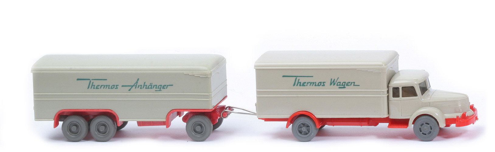 Hellgelbgrau nur mit rotem Chassis im GK. Hier orangerot. Oben mit Anhänger 483/4c. |