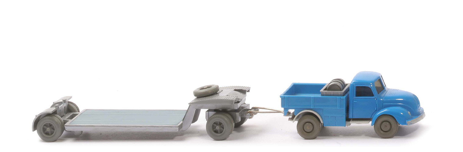 | | Zugmaschine | | Farbe Kabine | himmelblau | | Version Kabine | Typ 3 | | Stoßstange | abgeschrägt | | Kabinenboden | ohne Schlitz | | Verglasung | getönt | | Chassis Farbe | silbergrau | | Chassis Typ | Version 3a | | Bemalung | Scheinwerfer, Stoßstange silbern | | Achshalterungen | offen | | Bodenprägung | WM, Made in Germany | | Pritsche | himmelblau | | Ladung | Kiste mit Öltonne | | Farbe Tonne | silbern | | Räder | 11 mm glatt | | | Anhänger | | Grundfarbe | silber | | Hängertyp | Typ 3: Flachzapfen ohne Schlitz | | Bodenprägung | WM, Wiking, Germany, 49s, "1" | | Pritscheneinlage | mattgraublau | | Deichsel | Metall | | Bemalung Rückleuchten | rot | | Bemalung Rückstrahler | ohne | | Räder | 12mm Trilex, einteilig | | Farbe Räder | hellgrau |